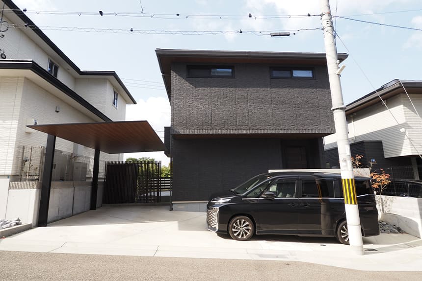 ブラックの柱に木調色の屋根が目を引くカーポートSC1台用を設置。お家の重厚感ともマッチして、ファサード全体に上質な統一感が生まれました。