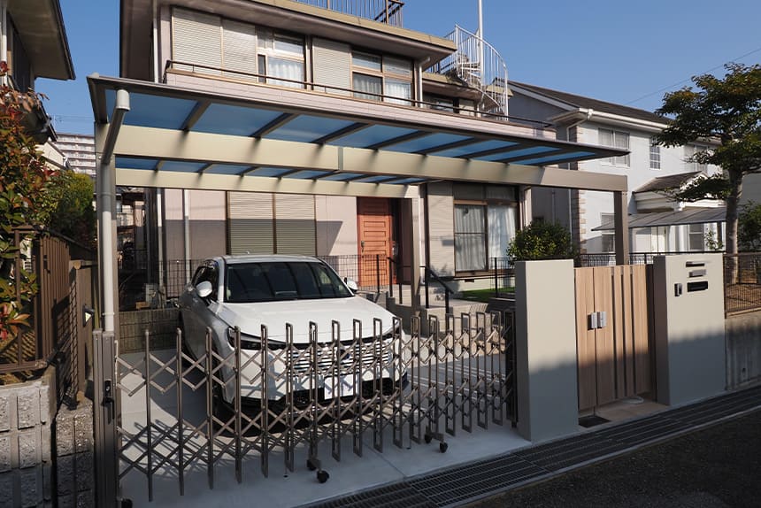 玄関前の植栽スペースと階段を撤去し、門扉から玄関まで一直線につながるスムーズなアプローチ動線へリニューアル。カーポートは屋根を広く・高く設計し、スムーズに乗り降りできる快適な駐車スペースになりました。