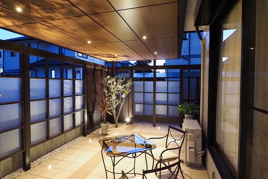 ダウンライトとグランドライトがお庭全体をやさしく照らし、壁や床に映る光の反射が、落ち着きある美しい夜の庭を演出します。
